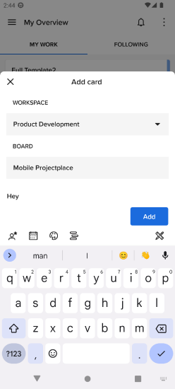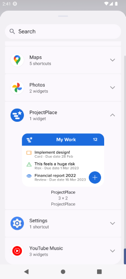 The ProjectPlace app for Android needs to be installed on your phone and as the next step you navigate to your home screen and search for ProjectPlace widget and add it. To be able to view your work in the widget you need to be logged into the ProjectPlace app. Widgets for the iOS widget is still under development.
